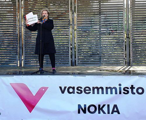 Nokian Vasemmiston valtuustoryhmän puheenjohtaja Teresa Kvick piti avajaispuheen: